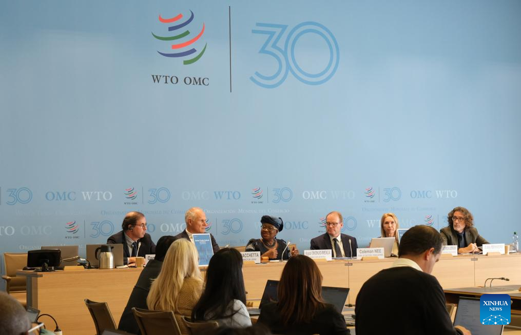 The World Trade Organization (WTO) Director-General Ngozi Okonjo-Iweala (3rd L) speaks at a press conference on WTO's latest Global Trade Outlook and Statistics report at the WTO headquarters in Geneva, Switzerland, Oct. 7, 2025. (Xinhua/Ma Ruxuan)