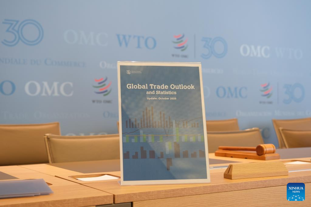The cover of the World Trade Organization (WTO)'s latest Global Trade Outlook and Statistics report is pictured at the WTO headquarters in Geneva, Switzerland, Oct. 7, 2025. (Xinhua/Ma Ruxuan)