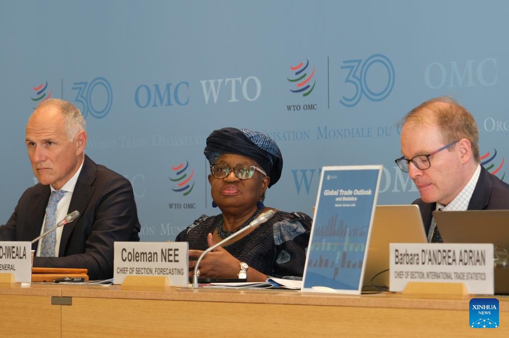 The World Trade Organization (WTO) Director-General Ngozi Okonjo-Iweala (C) speaks at a press conference on WTO's latest Global Trade Outlook and Statistics report at the WTO headquarters in Geneva, Switzerland, Oct. 7, 2025. (Xinhua/Ma Ruxuan)