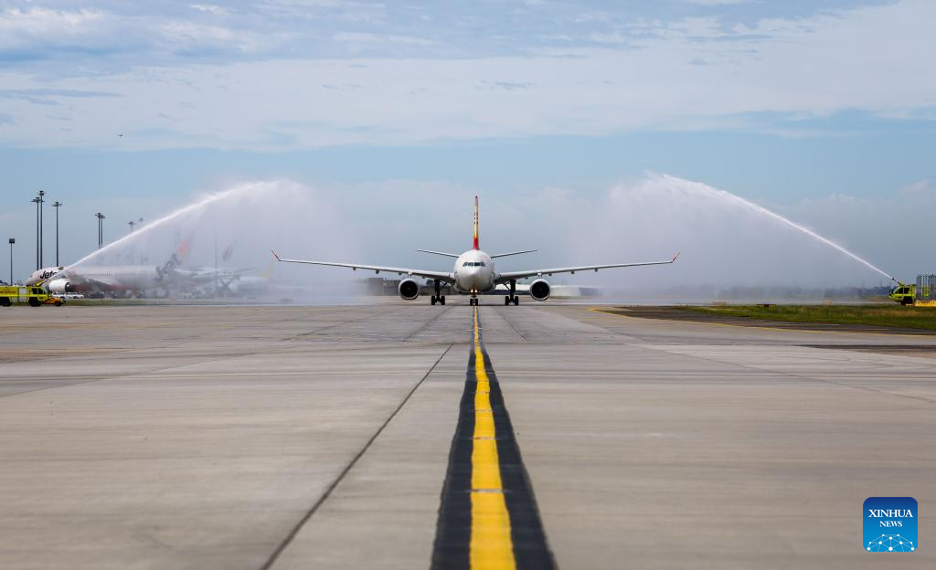 China's Hong Kong Airlines flight HX013 is welcomed by a water cannon salute upon arrival at the Melbourne Airport in Melbourne, Australia, Dec. 13, 2025. (Melbourne Airport/Handout via Xinhua)