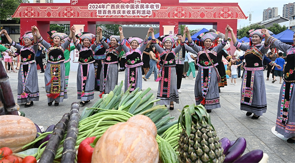 Farmers sang and danced at a park to celebrate the Chinese Farmers' Harvest Festival, Baise City, south China's Guangxi Zhuang Autonomous Region, September 22, 2024. /CFP