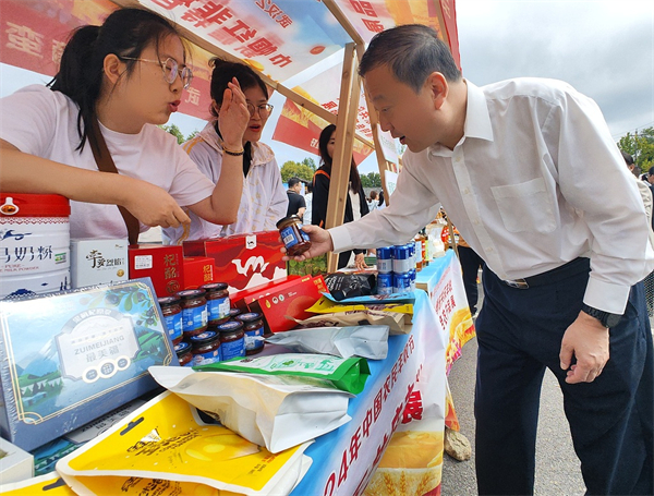 In east China's Jiangsu Province, the festivities started two days earlier in Zhenjiang City. Visitors flocked to the buzzing agricultural market to buy grapes, tea pastries, beef jerky and flowers. Staff members enthusiastically introduced the unique flavors and benefits of their local specialties.