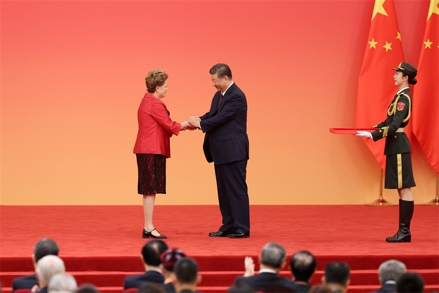President Xi awards Dilma Rousseff, former Brazilian president and president of the New Development Bank, with the Friendship Medal. The medal is the highest honor that China awards to foreign friends. [WANG ZHUANGFEI/CHINA DAILY]