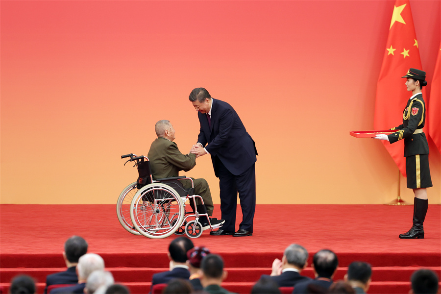President Xi presents Huang Zongde, a war hero, with the Medal of the Republic, which honors people who have made exceptional contributions to the development of the PRC. [WANG ZHUANGFEI/CHINA DAILY]