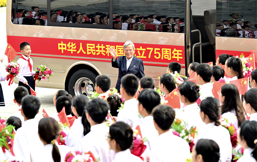 Members of the Chinese Young Pioneers salute the recipients of national medals and national honorary titles at the award ceremony on Sunday. [Photo/Xinhua]