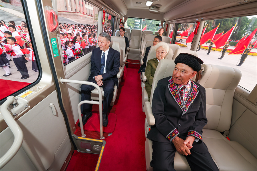 Recipients of national honorary titles arrive at the Great Hall of the People as part of a motorcade on Sunday. [Photo/Xinhua]