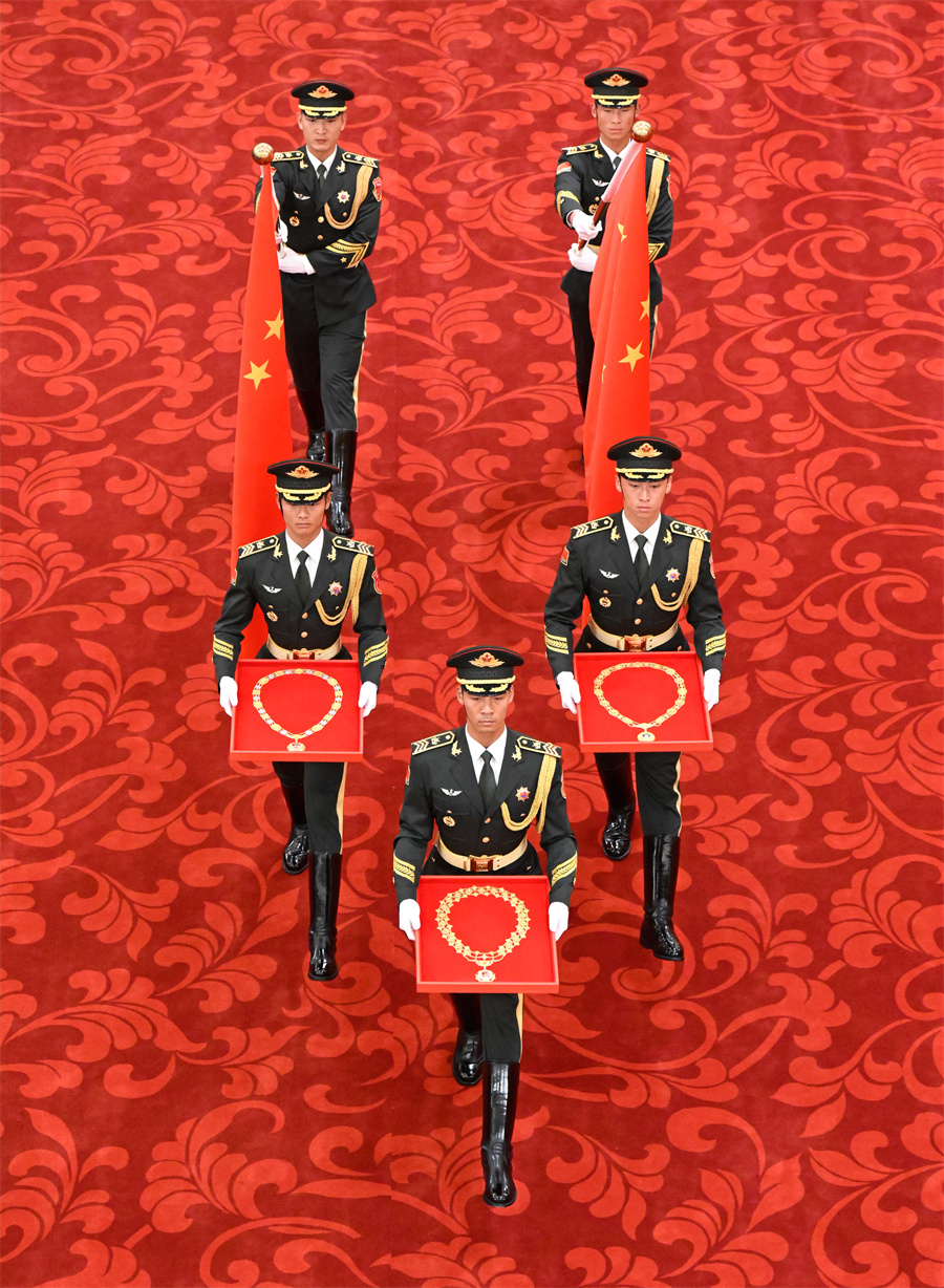 Guards of honor escort honorary medals to the venue of the presentation ceremony on Sunday. During the ceremony in Beijing, 15 individuals were awarded China's national medals and national honorary titles. [Photo/Xinhua]