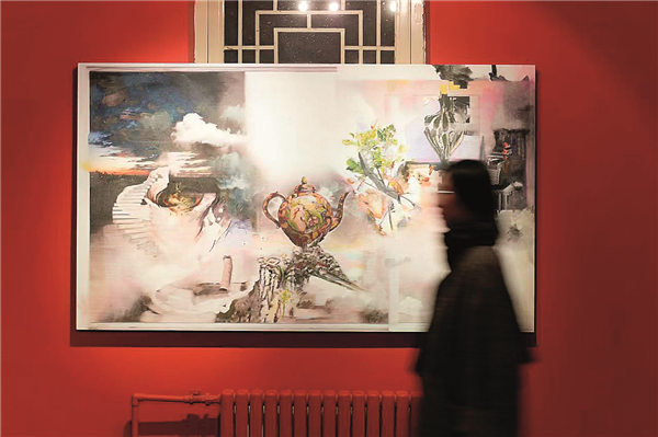 A visitor walks past a painting by French artist Gaspar Willmann at his solo exhibition, Compression, at Yishu 8 gallery in Beijing. [Photo provided to China Daily]