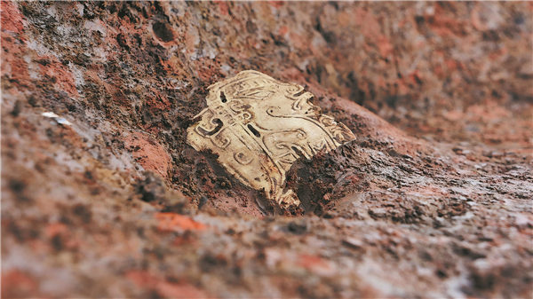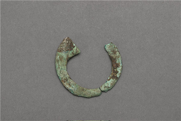 A bronze earring is among the new archaeological discoveries made at the Sanxingdui site in Guanghan, Sichuan province. On Thursday, the National Cultural Heritage Administration announced the new findings, including a jade-processing workshop, a massive terrace and a network of waterways. [Photo provided to China Daily]
