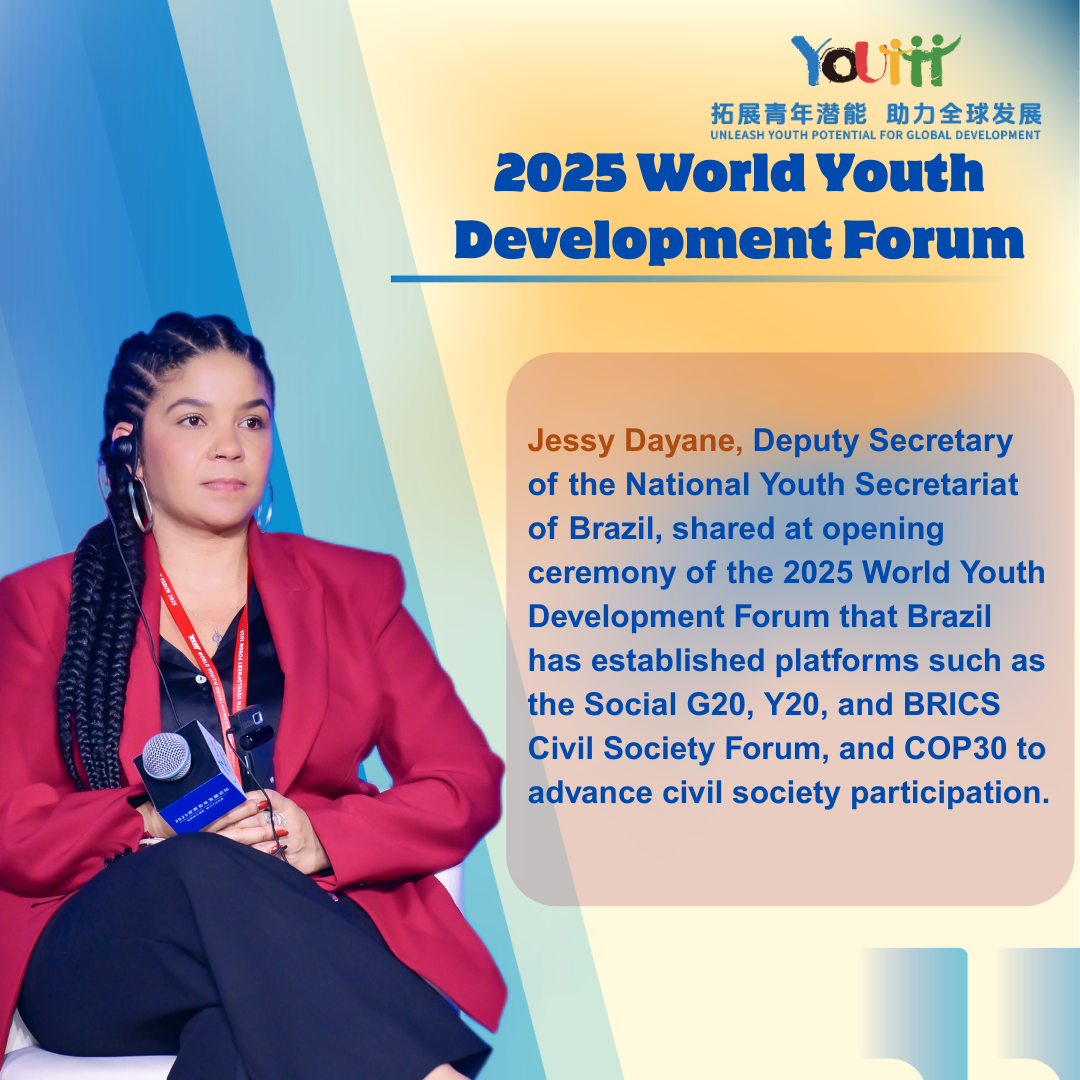 Jessy Dayane, Deputy Secretary of the National Youth Secretariat of Brazil, shared at opening ceremony of the 2025 World Youth Development Forum that Brazil has established platforms such as the Social G20, Y20, and BRICS Civil Society Forum, and COP30 to advance civil society participation.