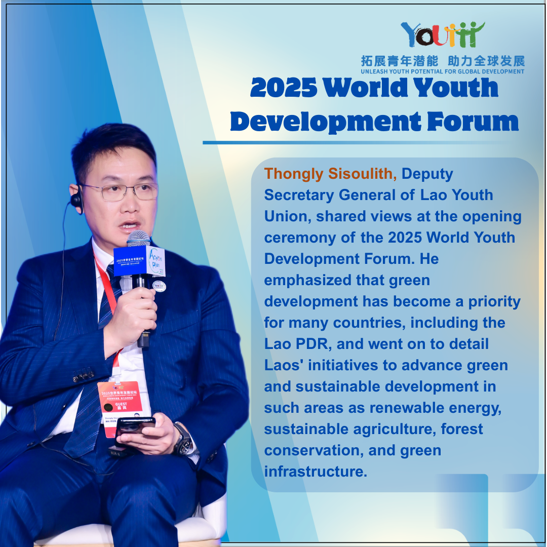 Thongly Sisoulith, Deputy Secretary General of Lao Youth Union, shared views at the opening ceremony of the 2025 World Youth Development Forum. He emphasized that green development has become a priority for many countries, including the Lao PDR, and went on to detail Laos' initiatives to advance green and sustainable development in such areas as renewable energy, sustainable agriculture, forest conservation, and green infrastructure.