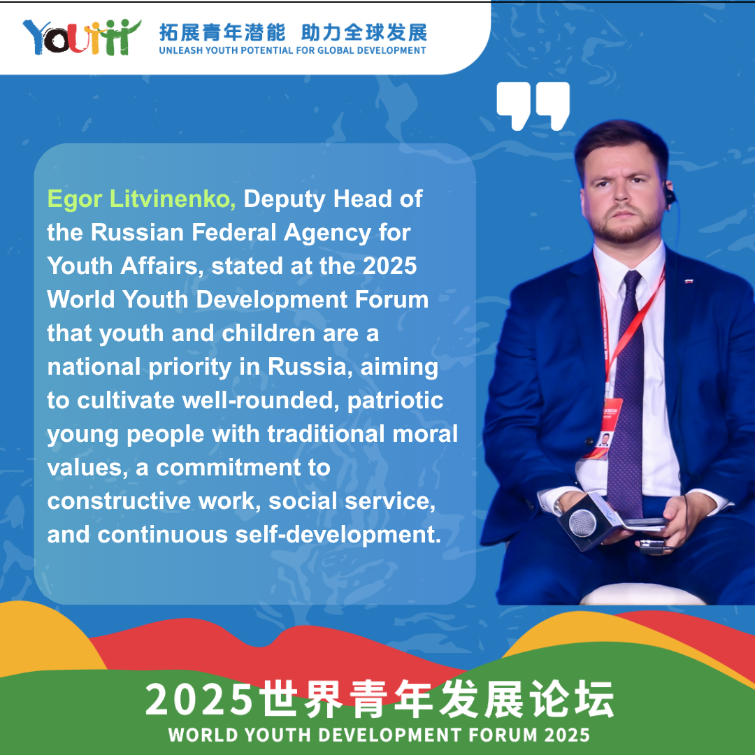 Egor Litvinenko, Deputy Head of the Russian Federal Agency for Youth Affairs, stated at the 2025 World Youth Development Forum that youth and children are a national priority in Russia, aiming to cultivate well-rounded, patriotic young people with traditional moral values, a commitment to constructive work, social service, and continuous self-development.