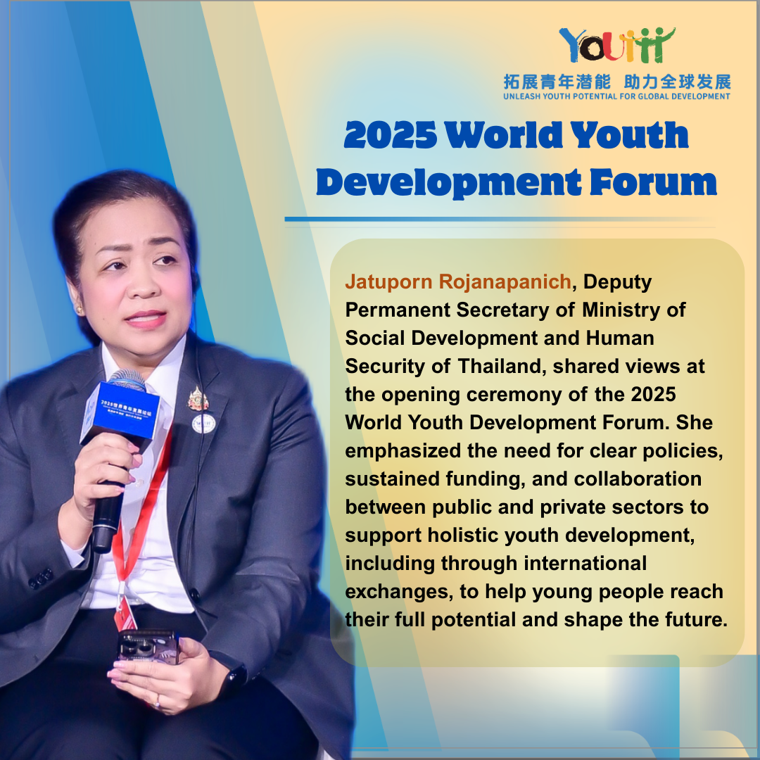 Jatuporn Rojanapanich, Deputy Permanent Secretary of Ministry of Social Development and Human Security of Thailand, shared views at the opening ceremony of the 2025 World Youth Development Forum. She emphasized the need for clear policies, sustained funding, and collaboration between public and private sectors to support holistic youth development, including through international exchanges, to help young people reach their full potential and shape the future.
