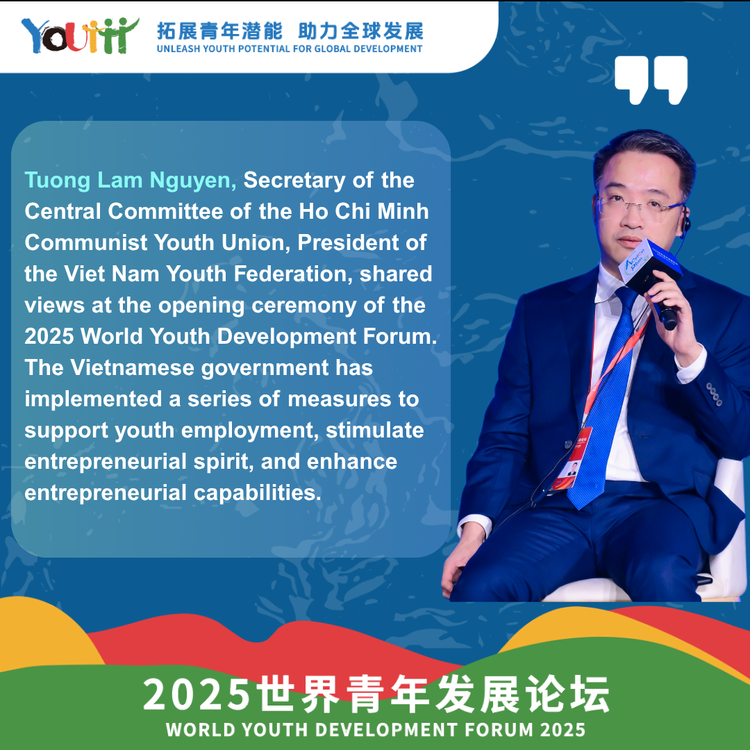 Tuong Lam Nguyen, Secretary of the Central Committee of the Ho Chi Minh Communist Youth Union, President of the Viet Nam Youth Federation, shared views at the opening ceremony of the 2025 World Youth Development Forum. The Vietnamese government has implemented a series of measures to support youth employment, stimulate entrepreneurial spirit, and enhance entrepreneurial capabilities.
