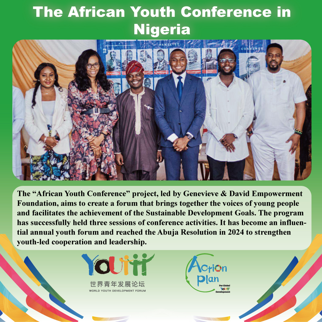 The “African Youth Conference” project, led by Genevieve & David Empowerment Foundation, aims to create a forum that brings together the voices of young people and facilitates the achievement of the Sustainable Development Goals. The program has successfully held three sessions of conference activities. It has become an influential annual youth forum and reached the Abuja Resolution in 2024 to strengthen youth-led cooperation and leadership.