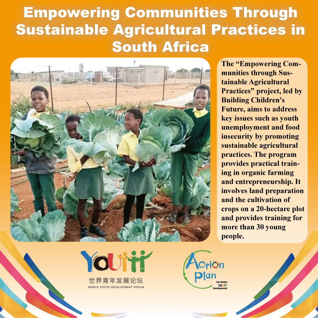 The “Empowering Communities through Sustainable Agricultural Practices” project, led by Building Children's Future, aims to address key issues such as youth unemployment and food insecurity by promoting sustainable agricultural practices. The program provides practical training in organic farming and entrepreneurship. It involves land preparation and the cultivation of crops on a 20?hectare plot and provides training for more than 30 young people.