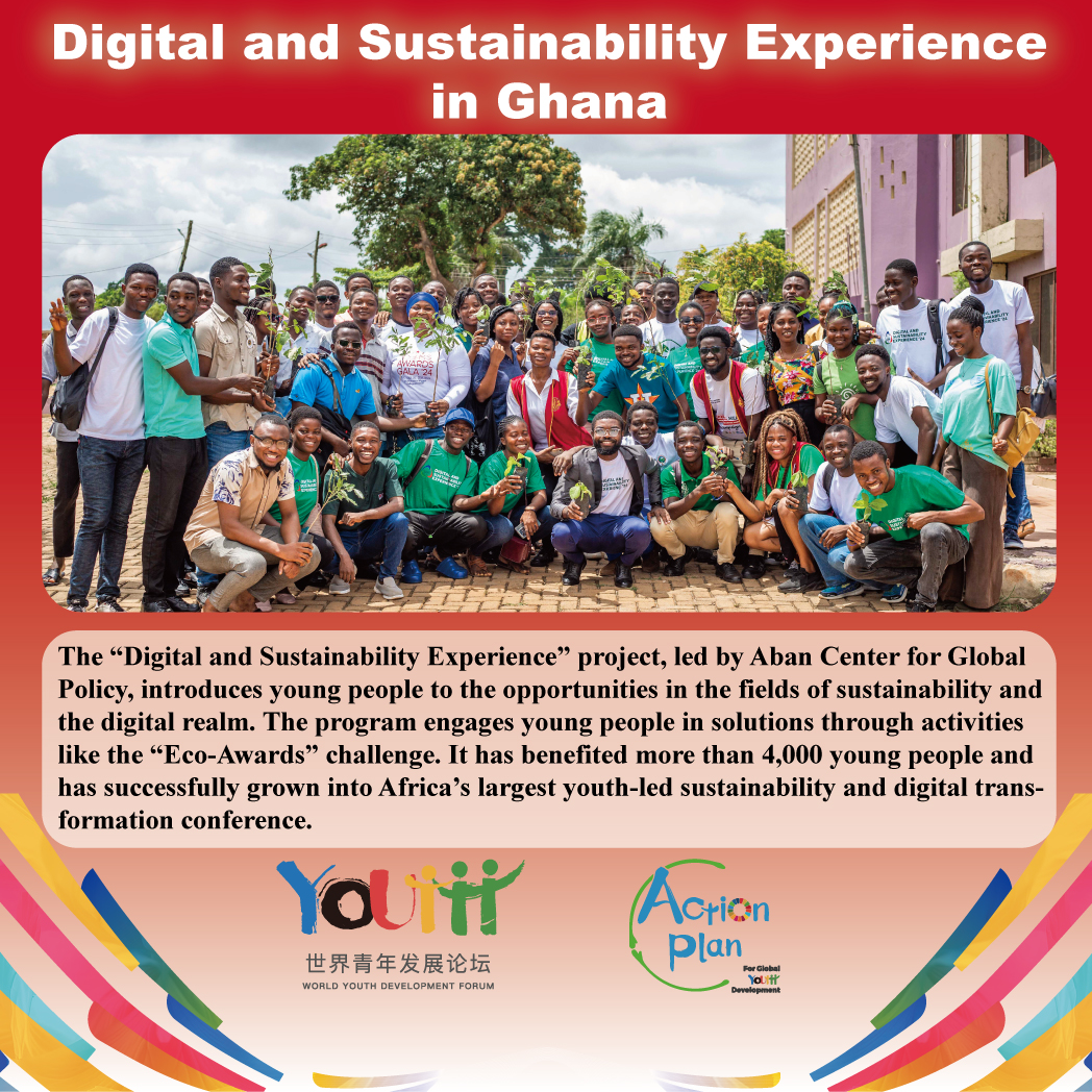 The “Digital and Sustainability Experience” project, led by Aban Center for Global Policy, introduces young people to the opportunities in the fields of sustainability and the digital realm. The program engages young people in solutions through activities like the “Eco-Awards” challenge. It has benefited more than 4,000 young people and has successfully grown into Africa’s largest youth-led sustainability and digital transformation conference.