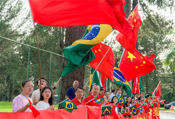 Representatives of overseas Chinese, Chinese institutions and students wave the national flags of China and Brazil on the roadside, congratulating Chinese President Xi Jinping on the complete success of his visit, while Xi's motorcade is on its way to the airport in Brasilia, Brazil, Nov 21, 2024. Xi left Brasilia on Thursday after attending the 19th G20 Leaders' Summit and paying a state visit to Brazil. [Photo/Xinhua]