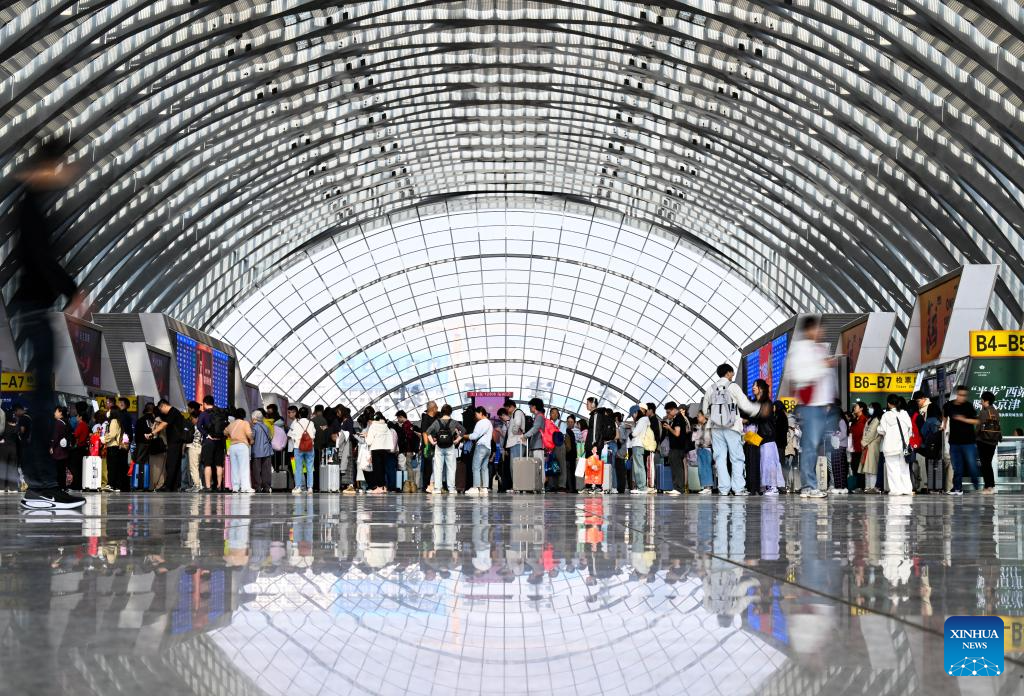 Passengers are pictured at the waiting hall of Tianjin West Railway Station in Tianjin, north China, Oct. 7, 2025. As the National Day and Mid-Autumn Festival holiday is drawing to a close, return travel flows increase across the country. (Xinhua/Zhao Zishuo)