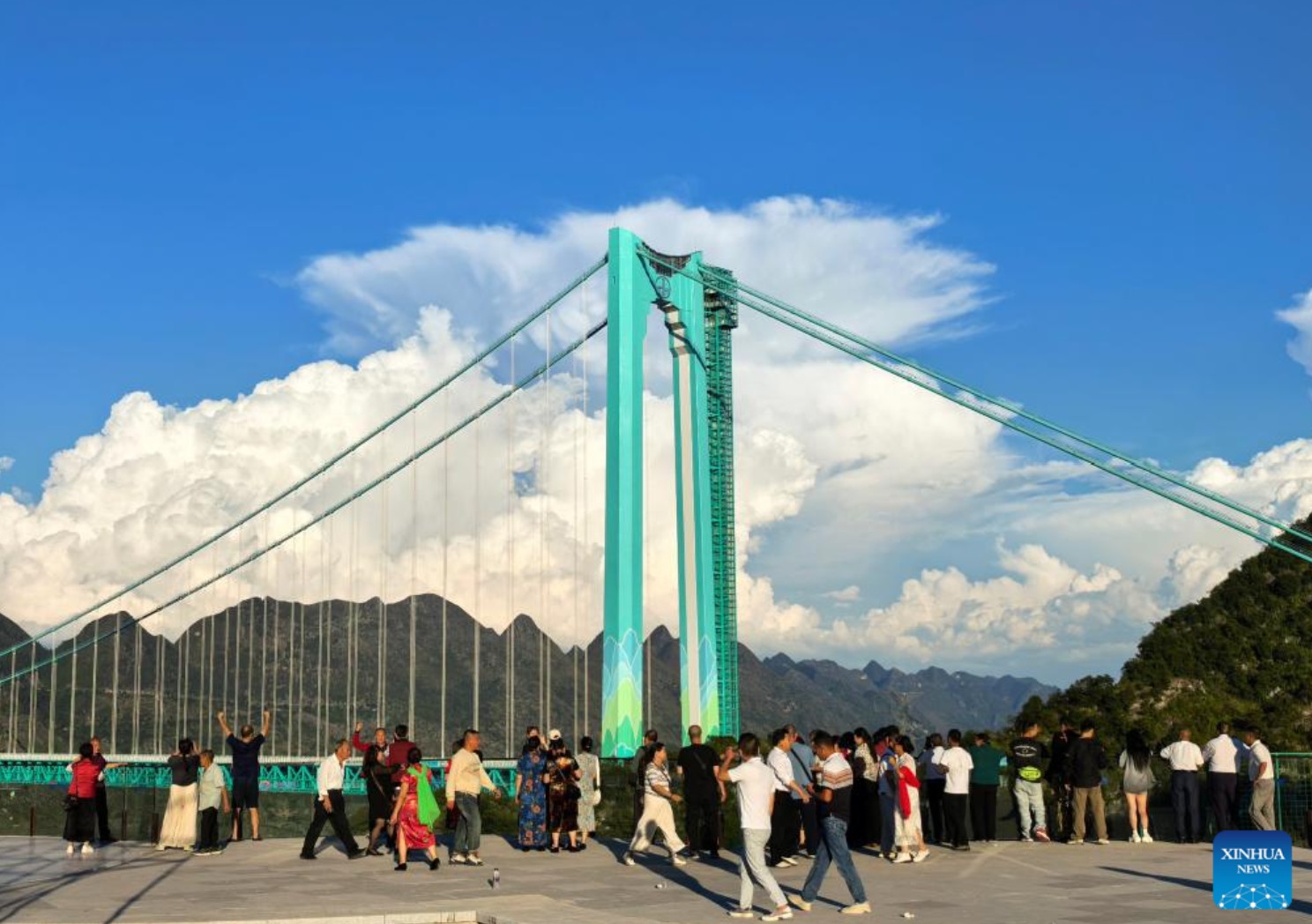 During China's eight-day National Day and Mid-Autumn Festival holiday ending on Wednesday, the newly opened Huajiang Grand Canyon Bridge, soaring 625 meters above the Beipan River, has become a major attraction.