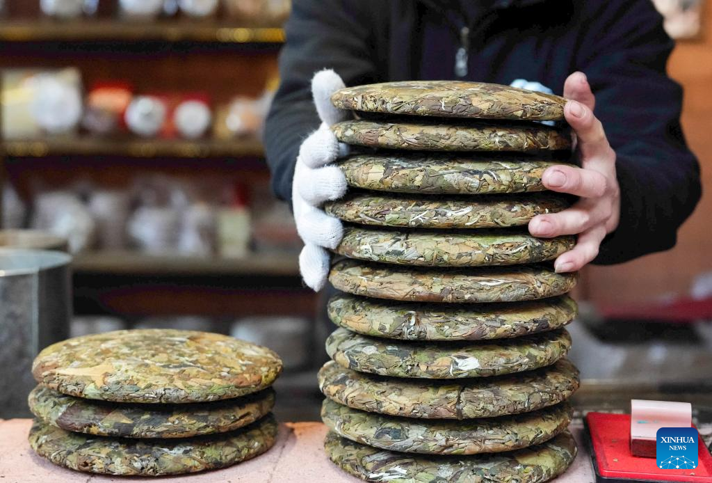 This photo taken on Jan. 14, 2026 shows Pu'er tea products in Nakeli Village, in Hani and Yi Autonomous County of Ning'er, Pu'er City, southwest China's Yunnan Province. The village of Nakeli, previously witnessed boisterous camel caravans carrying sacks of tea leaves while winding through ancient China's vast western area all the way to Southeast Asia and the Middle East. Today, the village has become a popular winter travel destination for tourists, thanks to its unique Tea Horse Road culture and pleasant climate. Besides visiting historical sites, tourists can also immerse themselves in activities such as making Pu'er tea products, retracing ancient paths on horseback, and tasting intangible cultural heritage cuisine. (Xinhua/Chen Xinbo)
