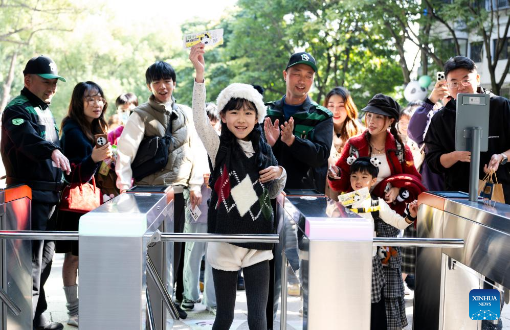 A child shows her ticket to the Panda world at the entrance in Fuzhou, southeast China's Fujian Province on Jan. 17, 2026. Five giant pandas, arriving from Chengdu, met the public at the reopened Fuzhou Panda World on Saturday, following a 20-day adaptation period. (Xinhua/Wei Peiquan)