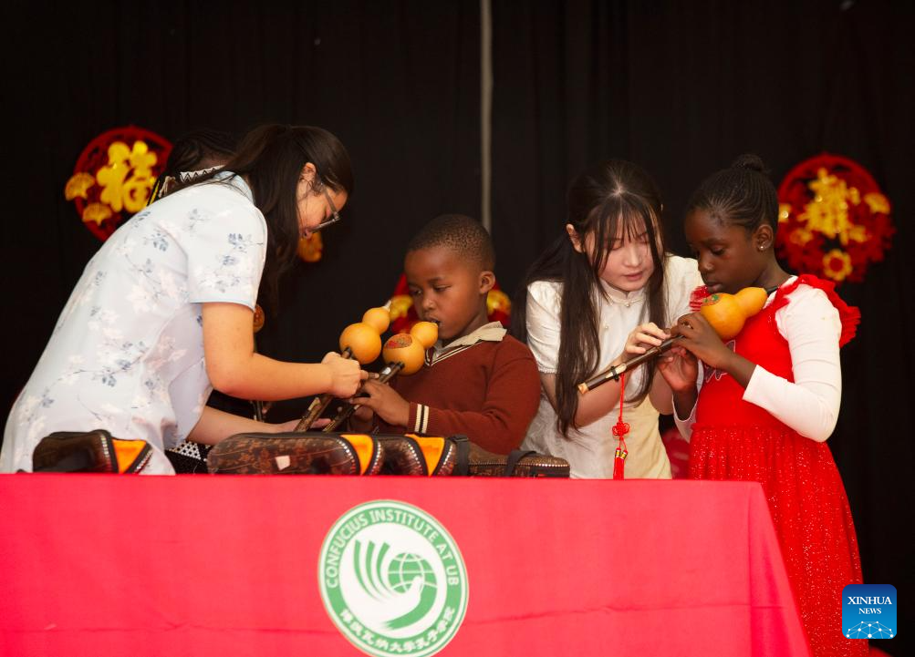 Students try Chinese musical instruments Hulusi in Gaborone, Botswana, Feb. 17, 2026. An event was held on Tuesday at a primary school in Gaborone, the capital of Botswana, to celebrate the Chinese Spring Festival, immersing local students in the richness of Chinese traditions and culture. (Photo by Tshekiso Tebalo/Xinhua)