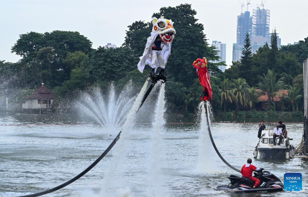Actors perform lion dance with water-powered jetpack flying machines to celebrate the Chinese New Year in Jakarta, Indonesia, Feb. 16, 2026. (Xinhua/Zulkarnain)