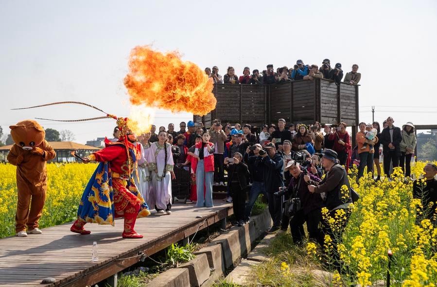 A Sichuan Opera artist performs for tourists in a rapeseed flower field in Jiuchi Town of Chengdu City, southwest China's Sichuan Province, March 11, 2026. (Photo by Luo Guoyang/Xinhua)