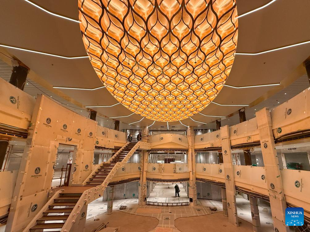 This photo taken on March 16, 2026 shows an interior view of the large cruise ship "Adora Flora City" in Shanghai, east China. China's second domestically built large cruise ship is expected to be delivered by the end of 2026, with the construction of its main structure completed, according to the shipbuilder, China State Shipbuilding Corporation (CSSC).