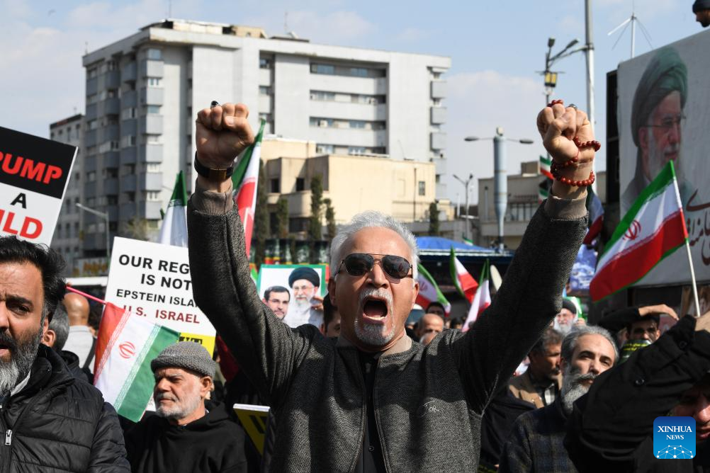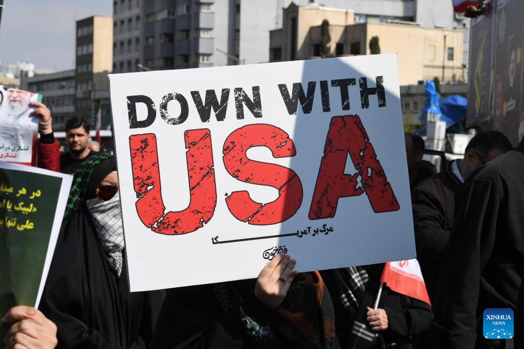 The crowd, waving Iran's flags and holding pictures of Iran's late Supreme Leader Ali Khamenei, chanted slogans against the United States and Israel.