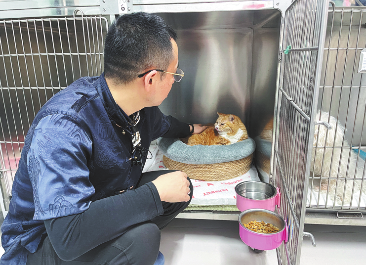 Zhang Kaiyan checks on a sick cat at his Beijing clinic. YANG FEIYUE/CHINA DAILY