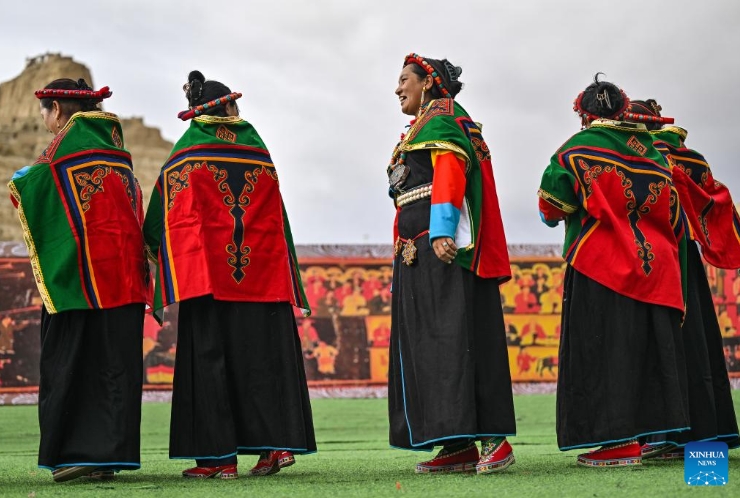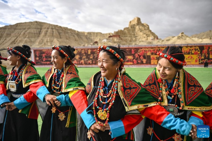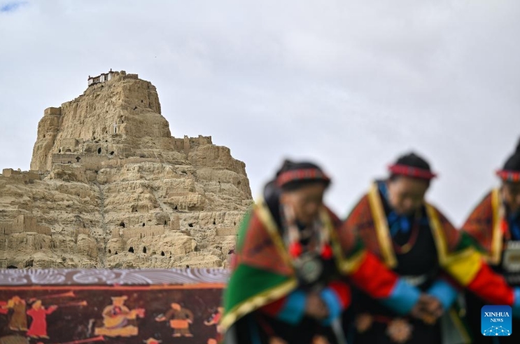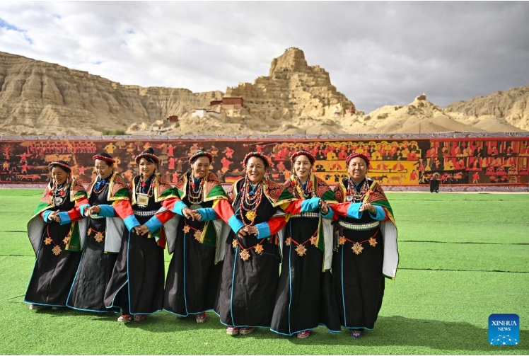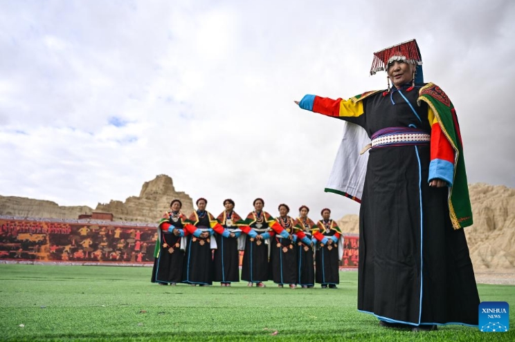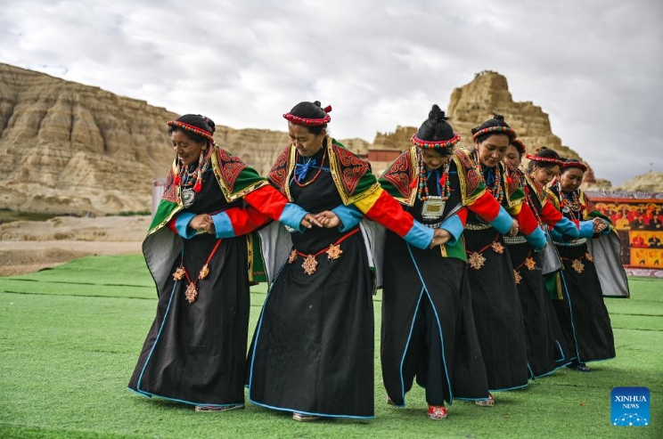 Local residents perform Xuan Dance near the ruins of the Guge Kingdom in Zanda County of Ngari Prefecture, southwest China's Xizang Autonomous Region, Sept. 11, 2024. The dance is a Tibetan cultural heritage from the ancient Guge Kingdom that mixes speech, singing and dancing. It was inscribed into the national intangible cultural heritage list in 2008. (Xinhua/Sun Ruibo)