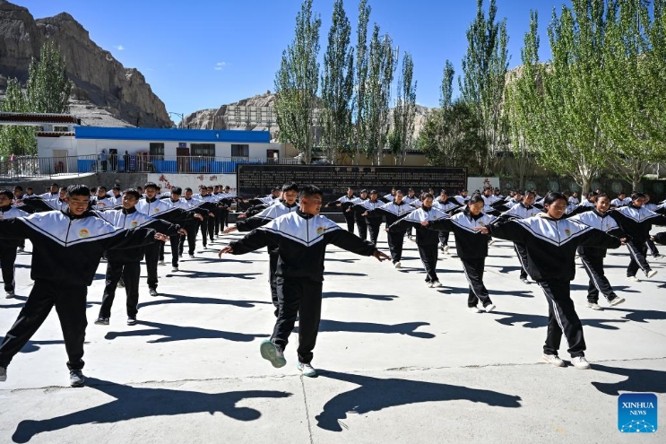 Students do a morning exercise which incorporates elements of the traditional Xuan Dance during a break at a school in Zanda County of Ngari Prefecture, southwest China's Xizang Autonomous Region, Sept. 10, 2024. The dance is a Tibetan cultural heritage from the ancient Guge Kingdom that mixes speech, singing and dancing. It was inscribed into the national intangible cultural heritage list in 2008. (Xinhua/Sun Ruibo)