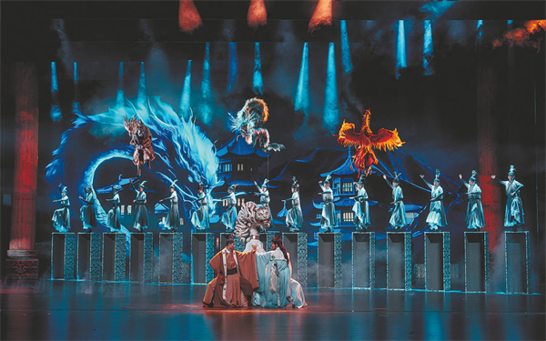 The production incorporates historical and cultural aspects of ancient Langzhong, including Chinese astronomy, folk dancing, and the story of Zhang Fei, a prominent general from the Three Kingdoms (220-280) period. [Photo by Liu Haidong/For China Daily]