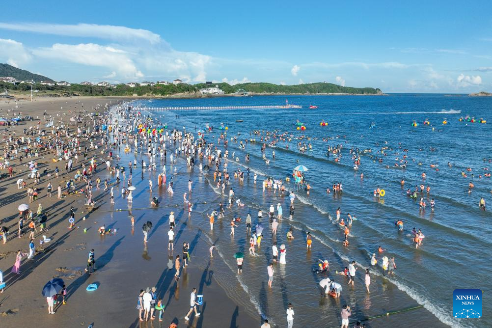 An aerial drone photo taken on Oct. 2, 2025 shows tourists having fun on a beach in Zhoushan, east China's Zhejiang Province. Tourist destinations across China are witnessing a surge in visitors as the country's eight-day National Day and Mid-Autumn Festival holiday began on Wednesday. (Photo by Zou Xunyong/Xinhua)