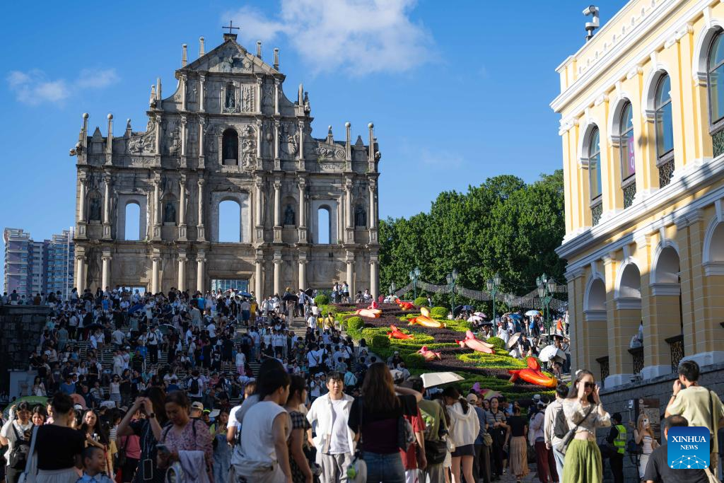 Tourists visit the Ruins of St. Paul's in south China's Macao, Oct. 2, 2025. Tourist destinations across China are witnessing a surge in visitors as the country's eight-day National Day and Mid-Autumn Festival holiday began on Wednesday. (Photo by Cheong Kam Ka/Xinhua)