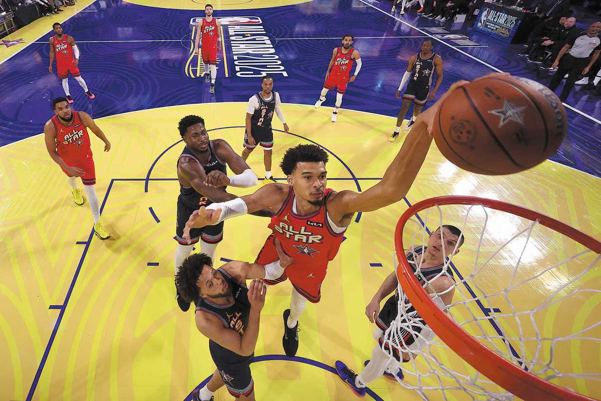 Victor Wembanyama of the San Antonio Spurs dunks the ball against Jaren Jackson Jr of the Memphis Grizzlies and Cade Cunningham of the Detroit Pistons during the NBA All-Star Game at Chase Center in San Francisco, California, on Sunday. AFP