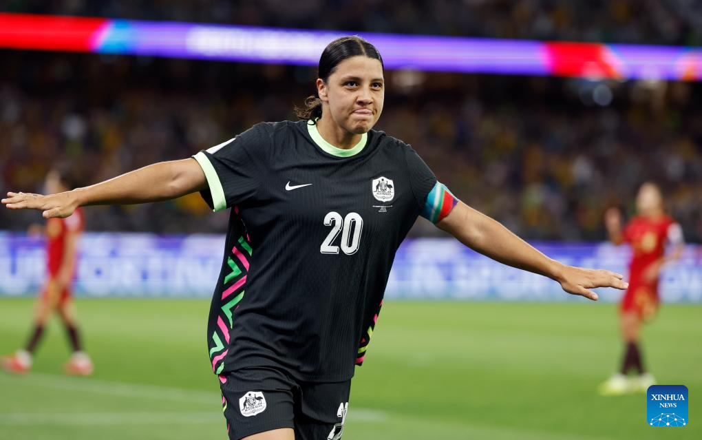 Sam Kerr of Australia celebrates a goal during the semifinal of Women's Asian Cup between China and Australia at Perth Stadium in Perth, Australia, March 17, 2026. (Xinhua/Ma Ping)