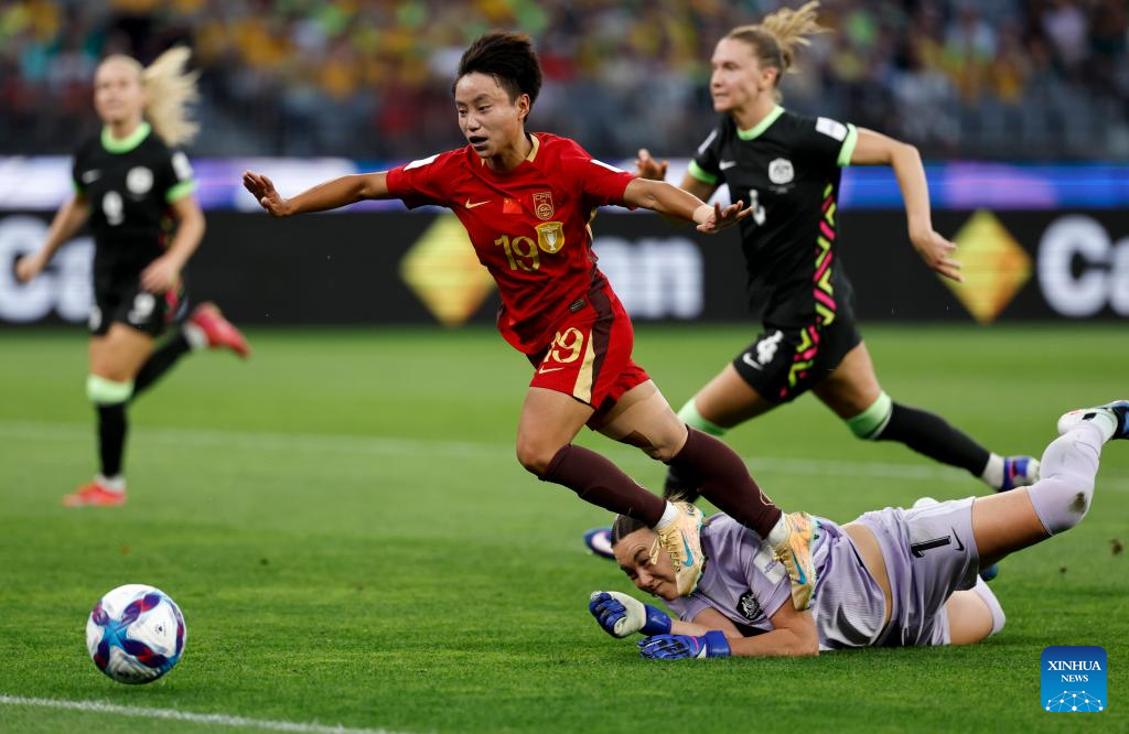 Zhang Linyan (L, top) of China is tackled by Mackenzie Arnold (bottom), goalkeeper of Australia, during the semifinal of Women's Asian Cup between China and Australia at Perth Stadium in Perth, Australia, March 17, 2026. (Xinhua/Ma Ping)