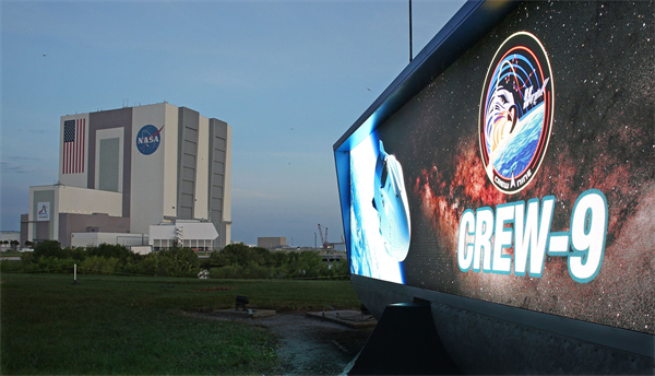 The Vehicle Assembly Building (left) and countdown clock for the Crew-9 mission are seen at dawn at the Kennedy Space Center in Florida, the United States, September 28, 2024. /CFP