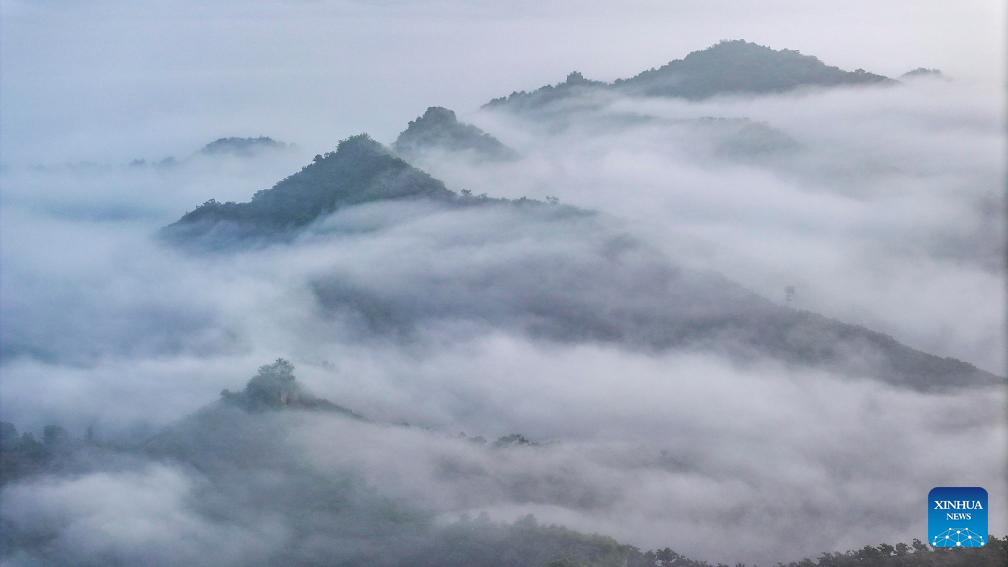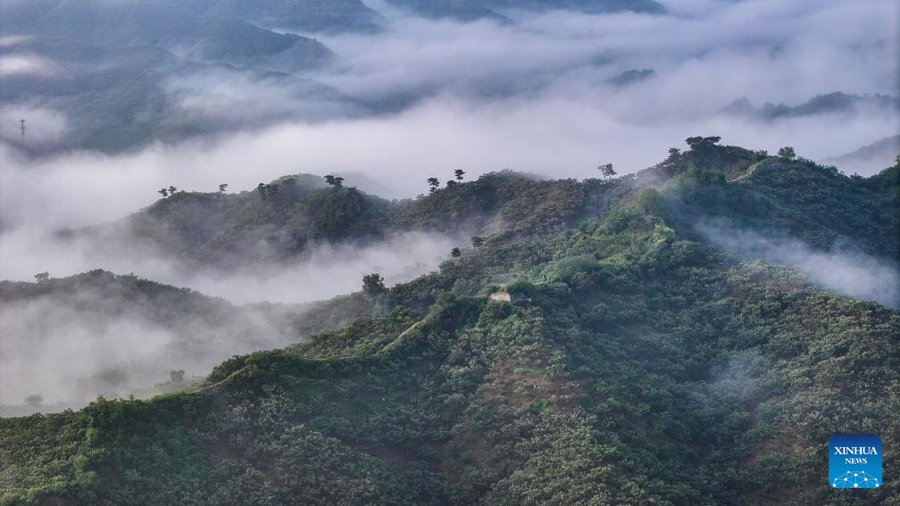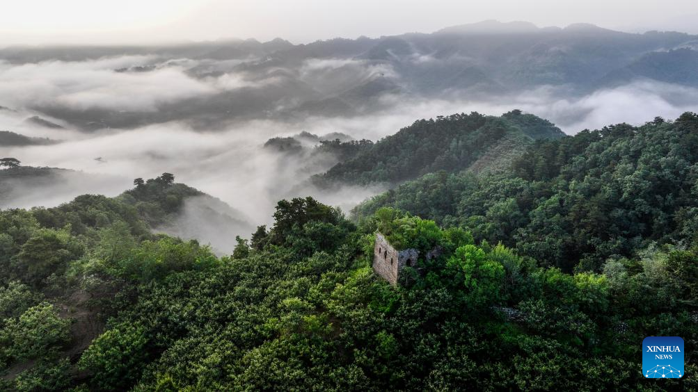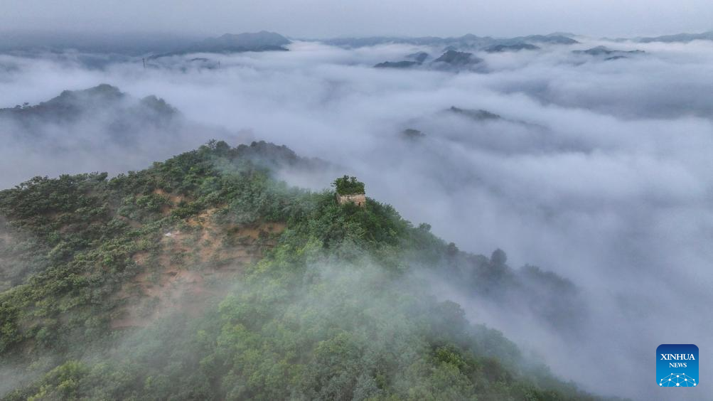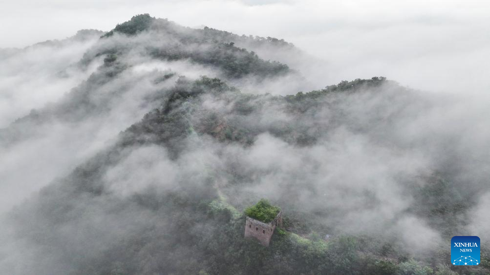 An aerial drone photo taken on Aug. 11, 2024 shows a section of the Great Wall shrouded in clouds in Xinglong County of Chengde City, north China's Hebei Province. (Photo by Liu Mancang/Xinhua)
