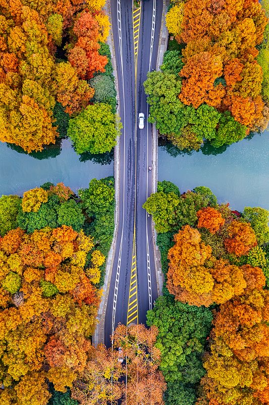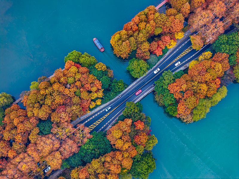 Recently, Yanggong Causeway in Hangzhou's West Lake has entered the best viewing period. The metasequoia and plane trees along the causeway are glittering in golden hues. Viewed from the air, it is just like a vivid golden autumn painting slowly unfolding in winter, fully demonstrating the beauty of nature.